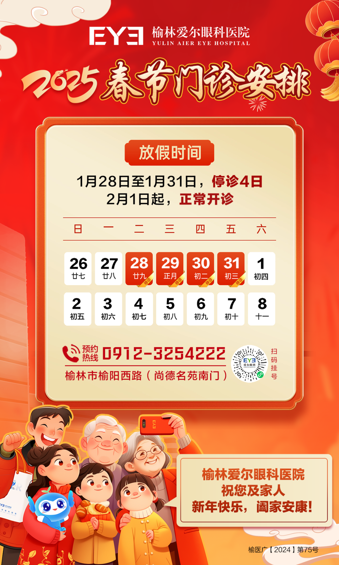 年关将近,感谢您一直以来对榆林爱尔眼科医院的信任与支持!2025年本院的春节门诊安排如下,请合理安排时间就诊