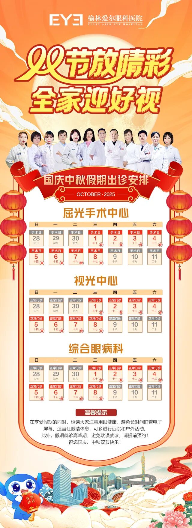 大家好!提前祝大家节日快乐,十一中秋假期将至,为方便患者朋友们就诊,榆林爱尔眼科医院在10月1日-8日,假期期间正常开诊,给广大市民提供专业便捷温馨的眼健康服务。